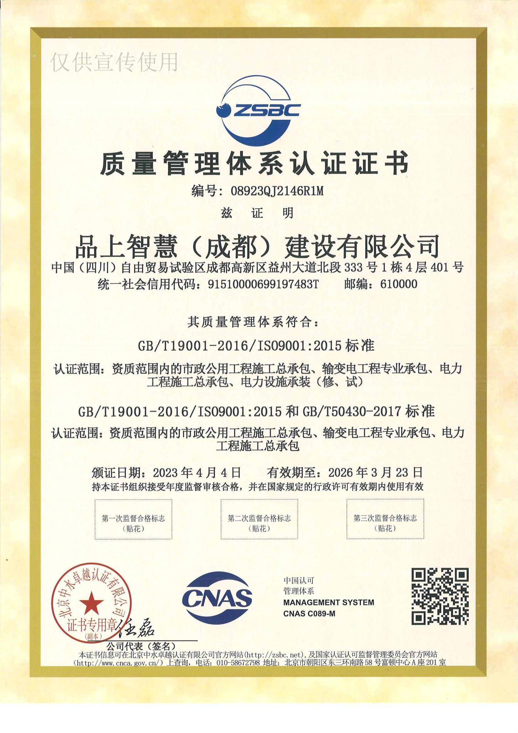 质量体系管理认证证书