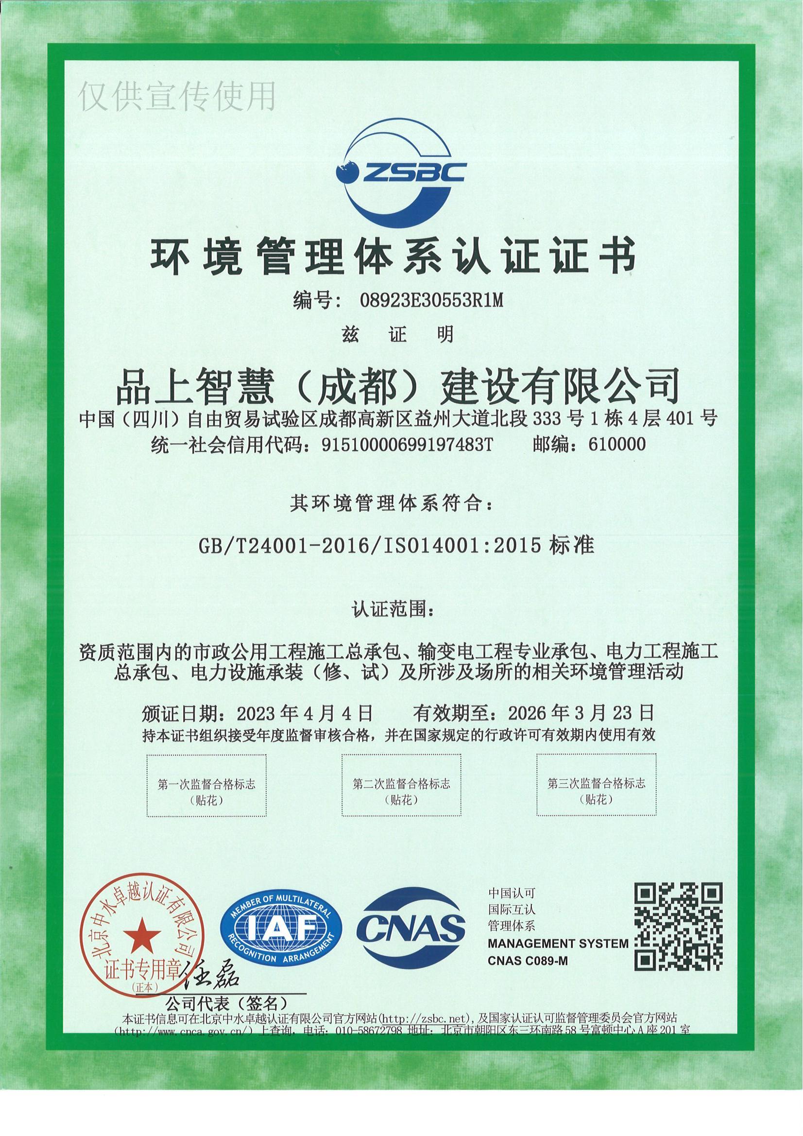 环境管理体系认证证书