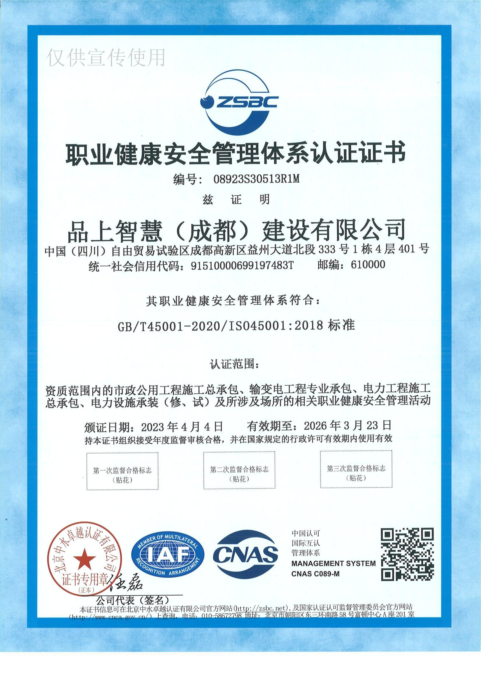 职业健康安全管理系统认证证书